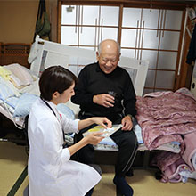 主治医の指示に基づいて調剤したお薬を薬剤師がお届けします。訪問時には担当薬剤師がお薬の説明、体調変化の有無、飲み忘れ・管理方法などについて確認し、患者様の服薬管理のサポートをします。